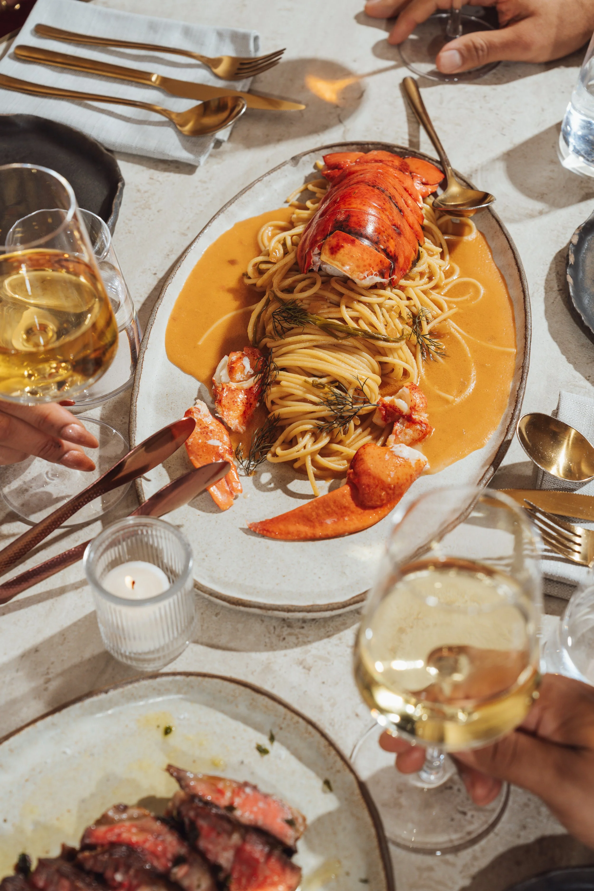 whole roasted 2lb lobster, brown butter-Metaxa sauce, olive oil, sea beans, pasta